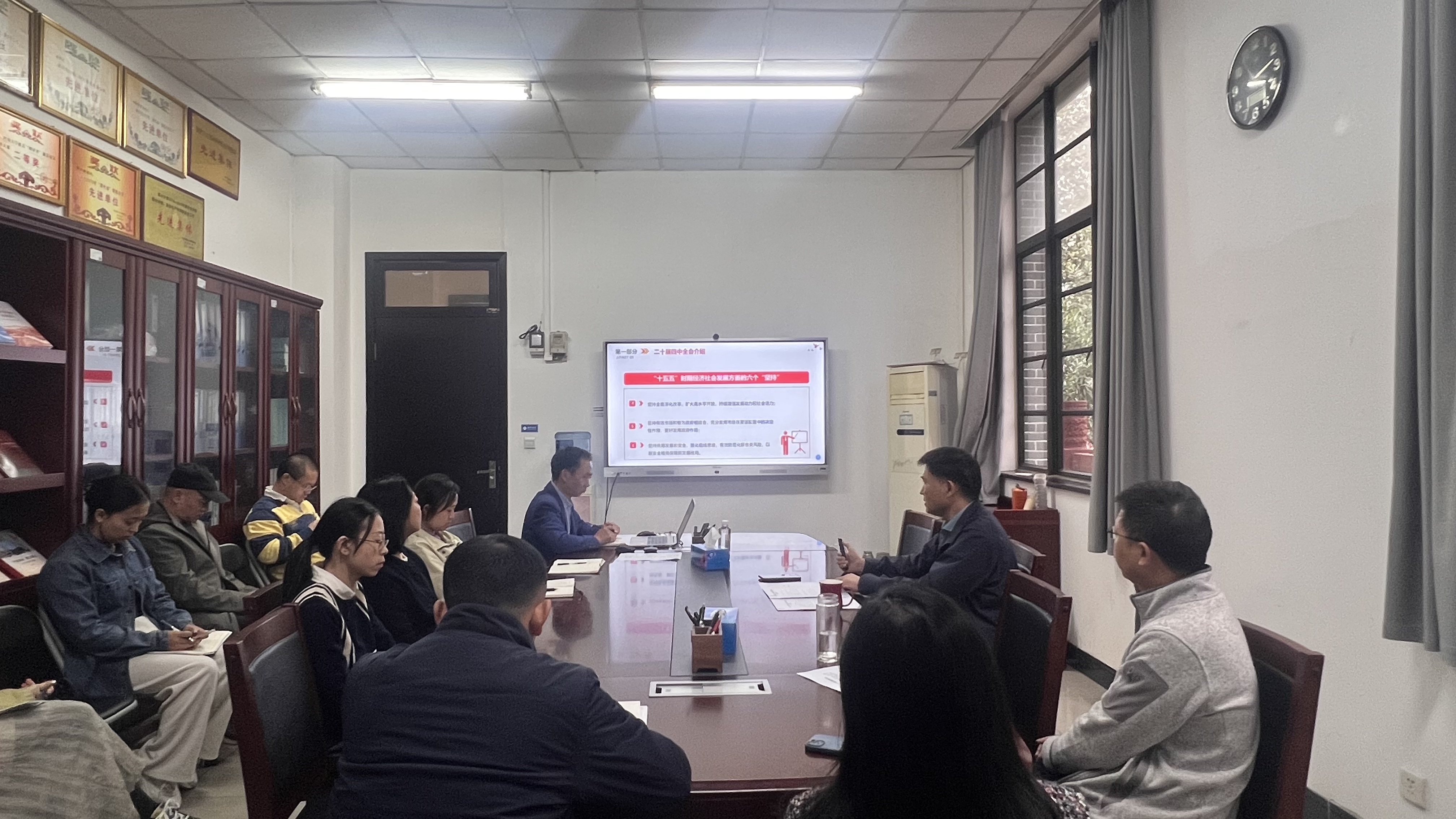 10月30日下午,资产管理处党支部召开主题党日(扩大)学习会,传达学习党的二十届四中全会精神。会议由支部书记、处长颜锦江主持,全体党员教职工参会。